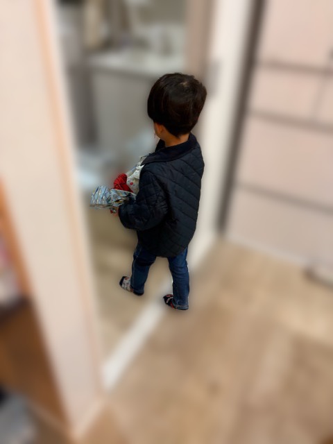 おうちに帰ってきて最初に、給食用の付近を洗濯かごに入れられるようになりました。
