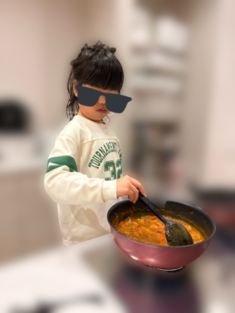 お鍋をかき混ぜたり、ルウを入れるタイミングを確認したり、真剣そのもの。